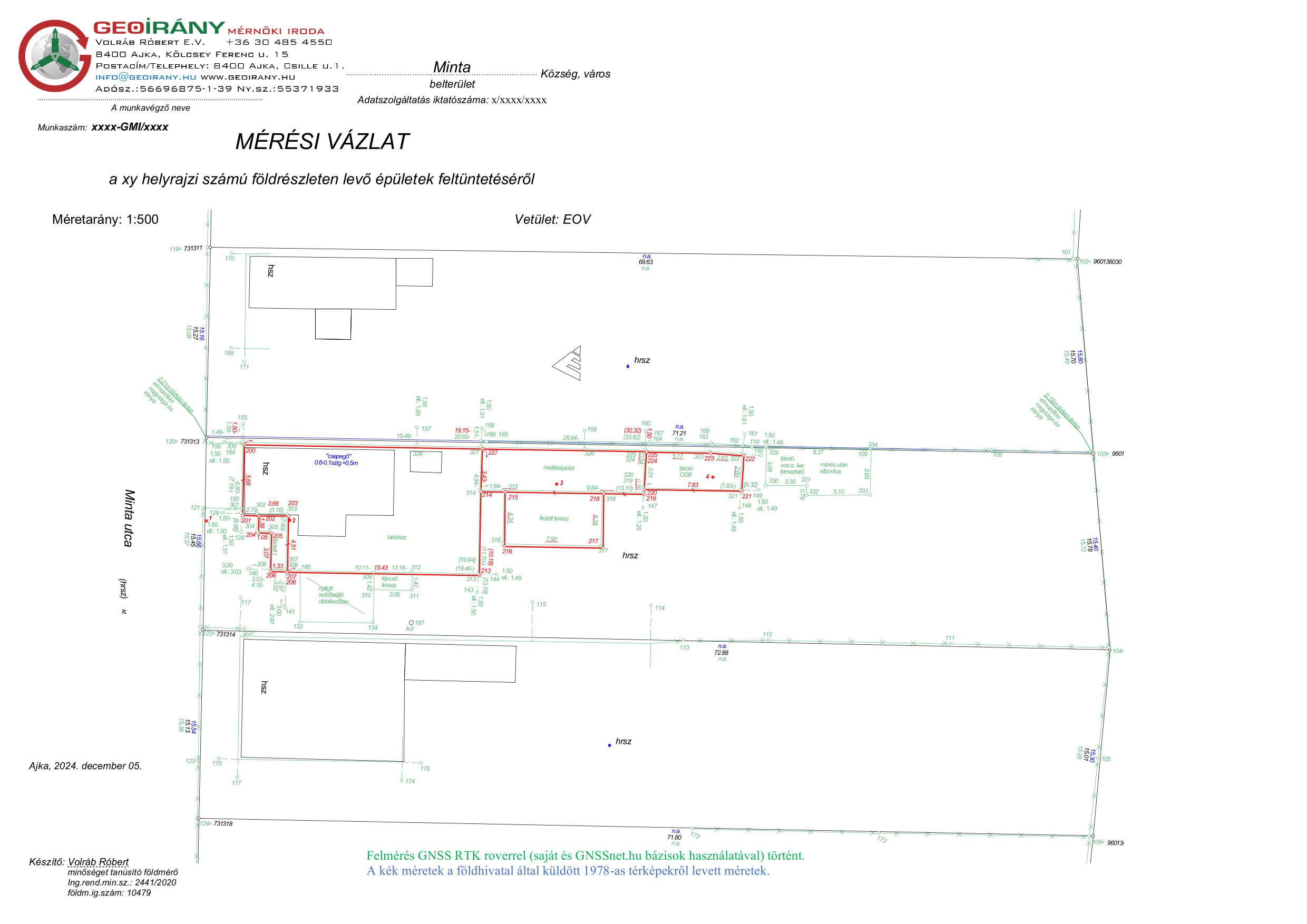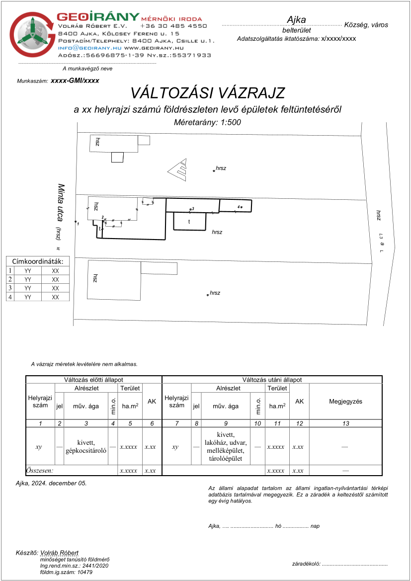 Ez a rajz szükséges ahhoz, hogy az épület jogszerűen bekerüljön az ingatlan-nyilvántartásba, illetve bontás esetén onnan törlésre kerüljön. A vázrajz pontosan ábrázolja az épület helyét, méretét és kapcsolatát a telekhatárokkal.