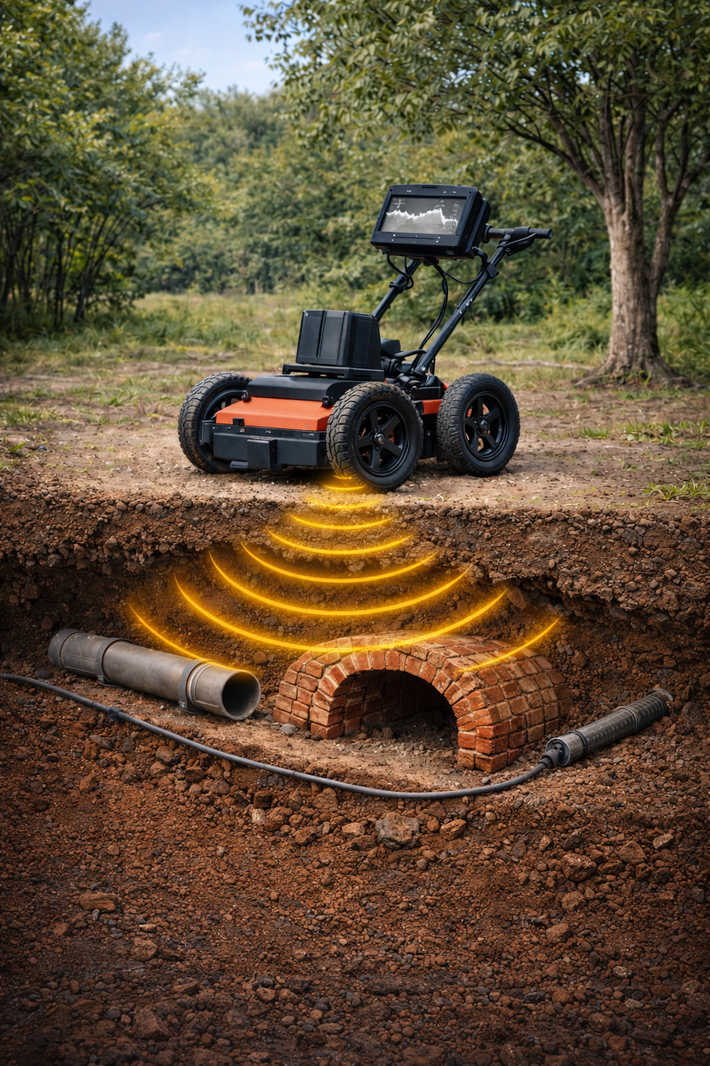 A felmérés során talajradar (GPR – Ground Penetrating Radar) berendezést alkalmazunk, amely nagyfrekvenciás elektromágneses hullámokat bocsát ki a talajba. A kibocsátott jelek visszaverődnek a különböző anyagszerkezetű föld alatti objektumokról – például víz- és szennyvízcsövekről, gázvezetékekről, elektromos kábelekről, optikai hírközlési hálózatokról, beton műtárgyakról vagy üregekről – és a visszaérkező jelek kiértékelésével meghatározható azok pontos helyzete, fektetési mélysége, iránya és szerkezeti jellege. A mért adatokat speciális szoftverekkel dolgozzuk fel, majd geodéziai koordinátarendszerbe (EOV) illesztve térképi formában is megjelenítjük, így a feltárt közművek egyértelműen beazonosíthatók a tervezési alaptérképeken.